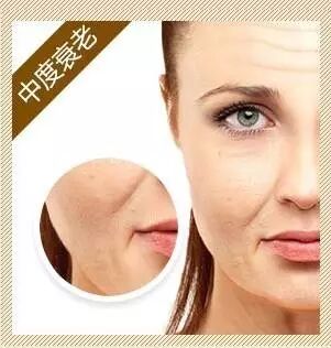 中度衰老:皱纹明显、皮肤开始变得粗糙暗淡、红润不再,老化加速、细胞和再生循环减慢明显。