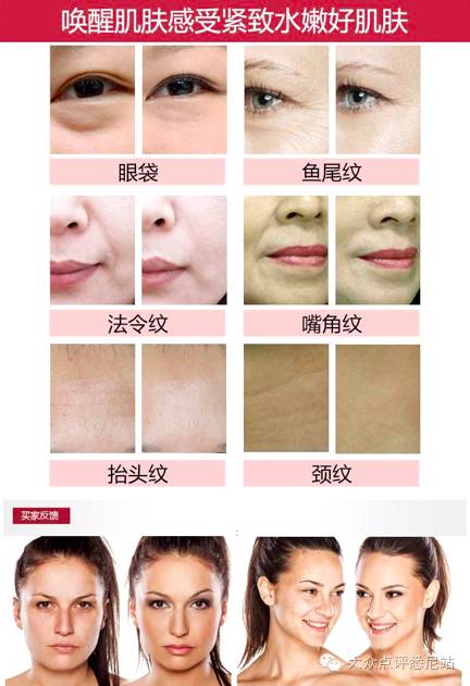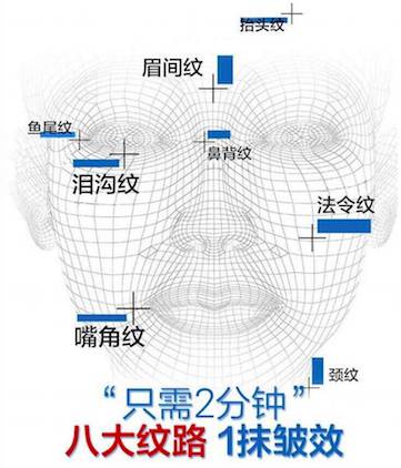 观其主要成分,最核心的的就是胜肽。EAORON液态超声刀利用先进科技,提取七胜肽和八胜肽。学术研究表明,七胜肽和八胜肽可以帮助改善因肌肉收缩造成的纹路,特别是在前额及眼睛附近的动态纹(表情纹)。这就解释了,为何EAORON液态超声刀能够深度抗皱去皱,对抗法令纹、抬头纹、嘴角纹、鱼尾纹、颈纹,提拉紧致肌肤。8大纹路,8大部位,轻松解决祛皱问题