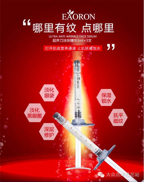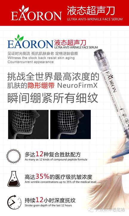 Eaoron继水光针之后经过一年多的测试、研发,2016研制成澳洲市面首款涂抹式超声刀抗皱针。EAORON液态超声刀,已经成为又一改变护肤理念爆款产品——祛皱神器。