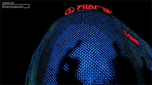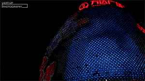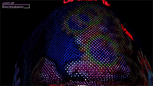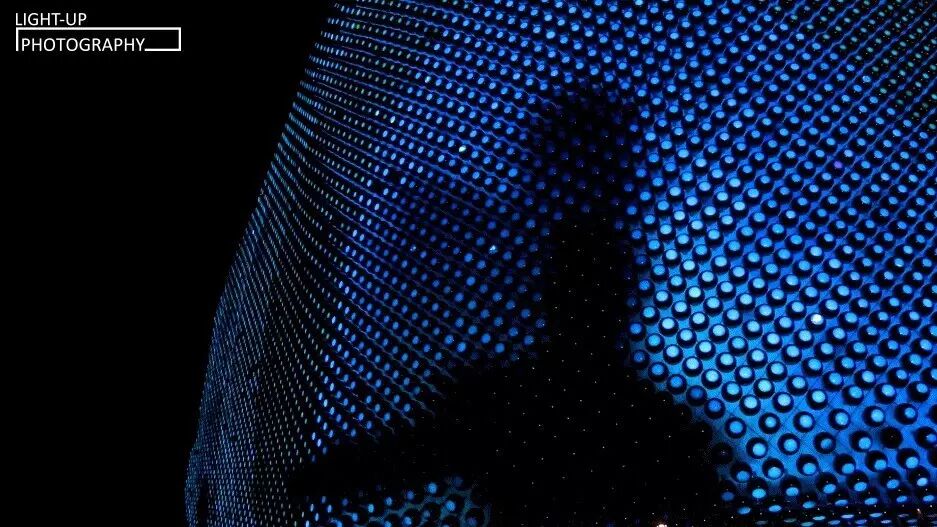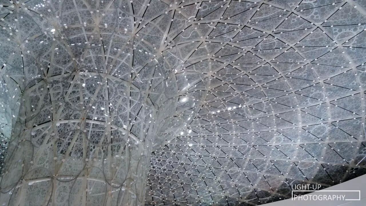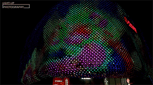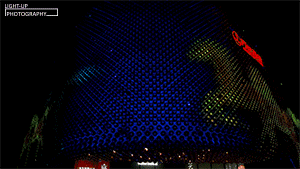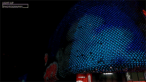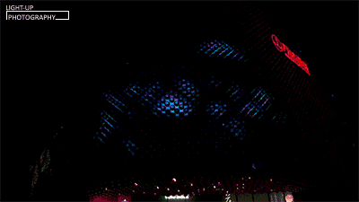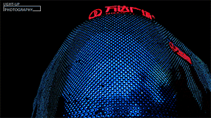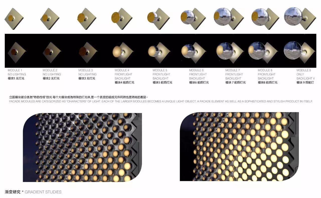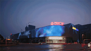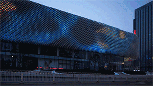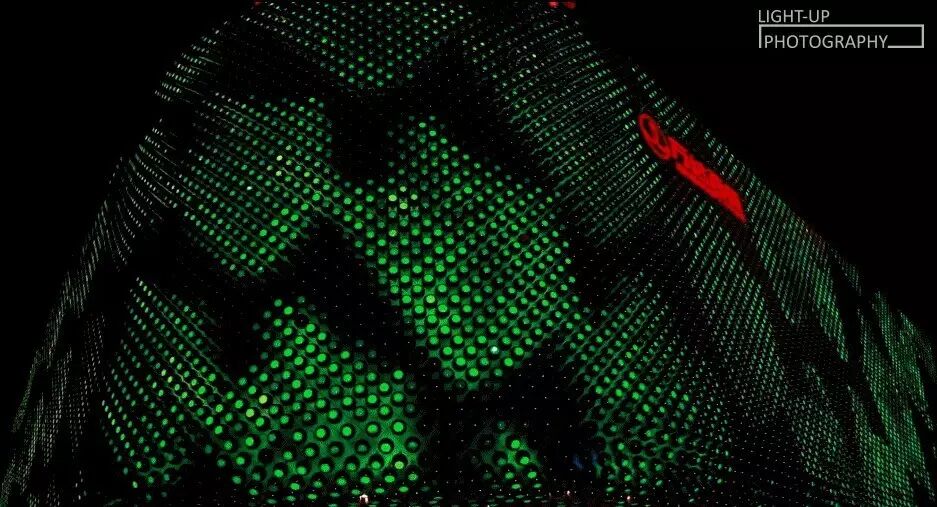 汉街万达广场利用幕墙上球体的结构,在球体正面呈现被雪花石玻璃匀散形成的直接光,在球体背面形成一种投向铝板幕墙的间接光,经过多次镜面反射的间接光和环境光,与直接光相结合,由它们组成点阵,形成像素化屏幕,既可以组成比较具象的图形,又可以由面发光形成画面图案背景,两者巧妙配合、灵活转换就可以幻化出丰富多彩的3D画面,而双层发光表面的前后距离,也创造了一个真实的景深效果。