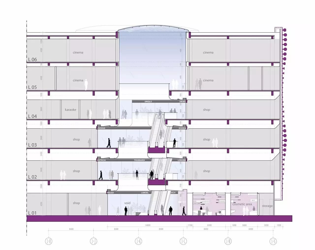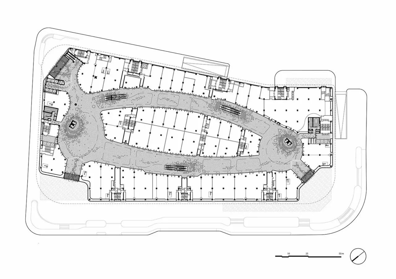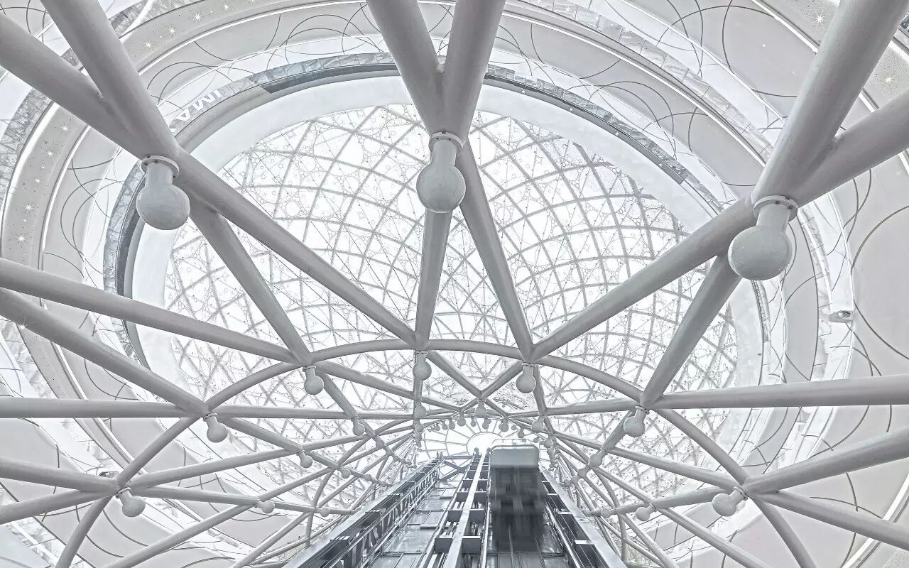 南中庭在一些细微之处采用带有反光效果的银色和灰色材料,体现了都市的形象和节奏。两个中庭都配备了全景升降机,中庭漏斗形的天窗将顶部和地面连在了一起。