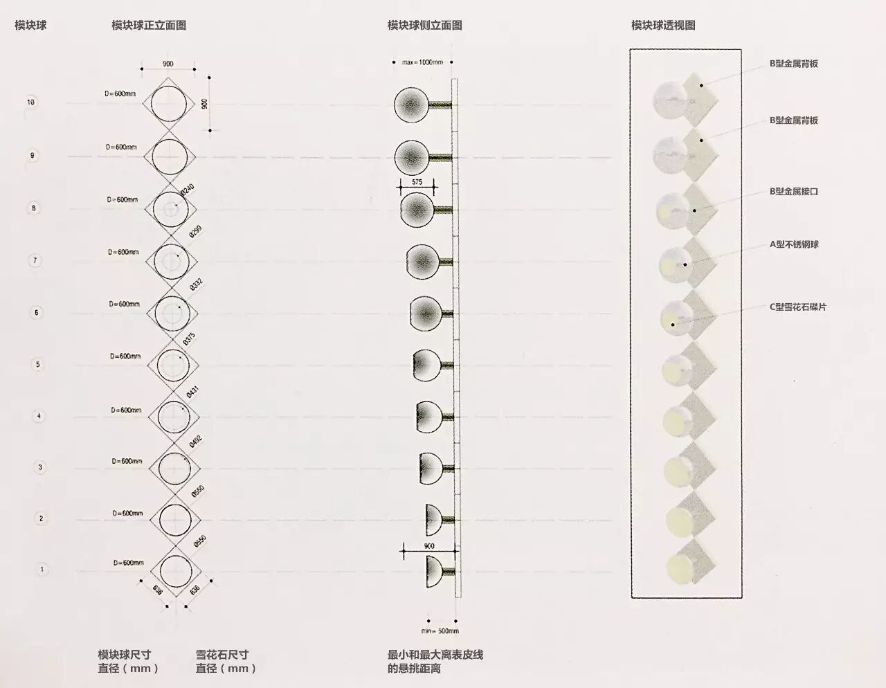 再有,根据球体截面面积大小的不同以及主次观赏面不同,对截面较小的球体以及次要立面上的球体内光源数量相应减少,又能节约一部分成本。通过多次试验论证,最终方案得到业主的认可。