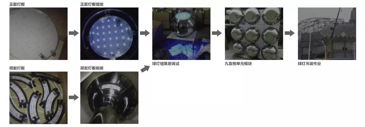 球灯在工程现场进行模块化组装,9个不锈钢球灯与铝板结构拼装成一个“九宫格”的单元模块,然后进行吊装作业,完成媒体幕墙安装后,在铝板幕墙后面作强电和弱电系统配管配线工程。