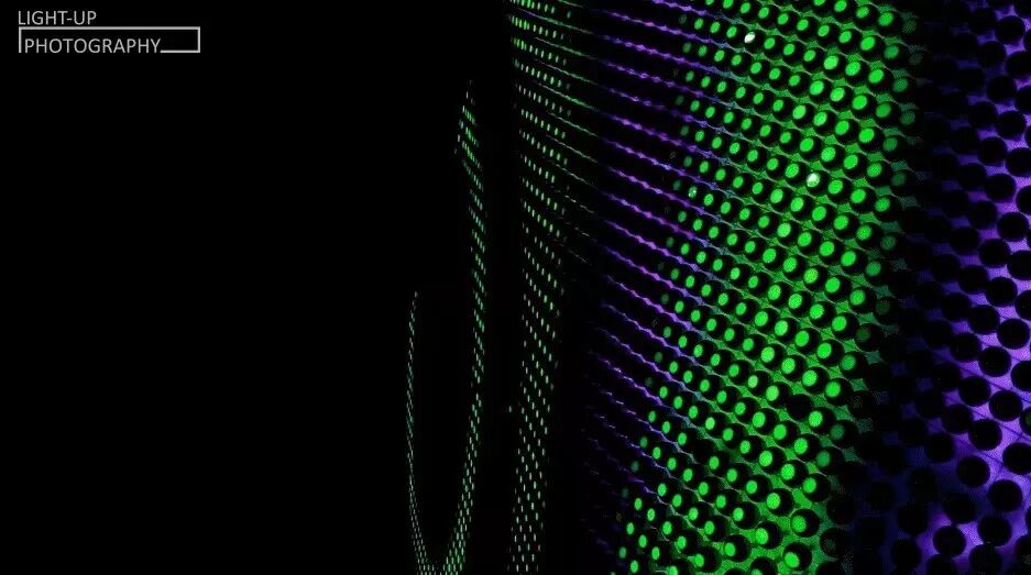 我们看到呈现在幕墙上的炫酷动画效果,实际上是通过两个独立而又相互关联的动画来实现的,一幅负责正面表层灯光,一幅负责背面底层灯光。通过画面中表层缥色的涟漪与底层琉璃蓝的水的隐约涌动,令画面产生平衡感。