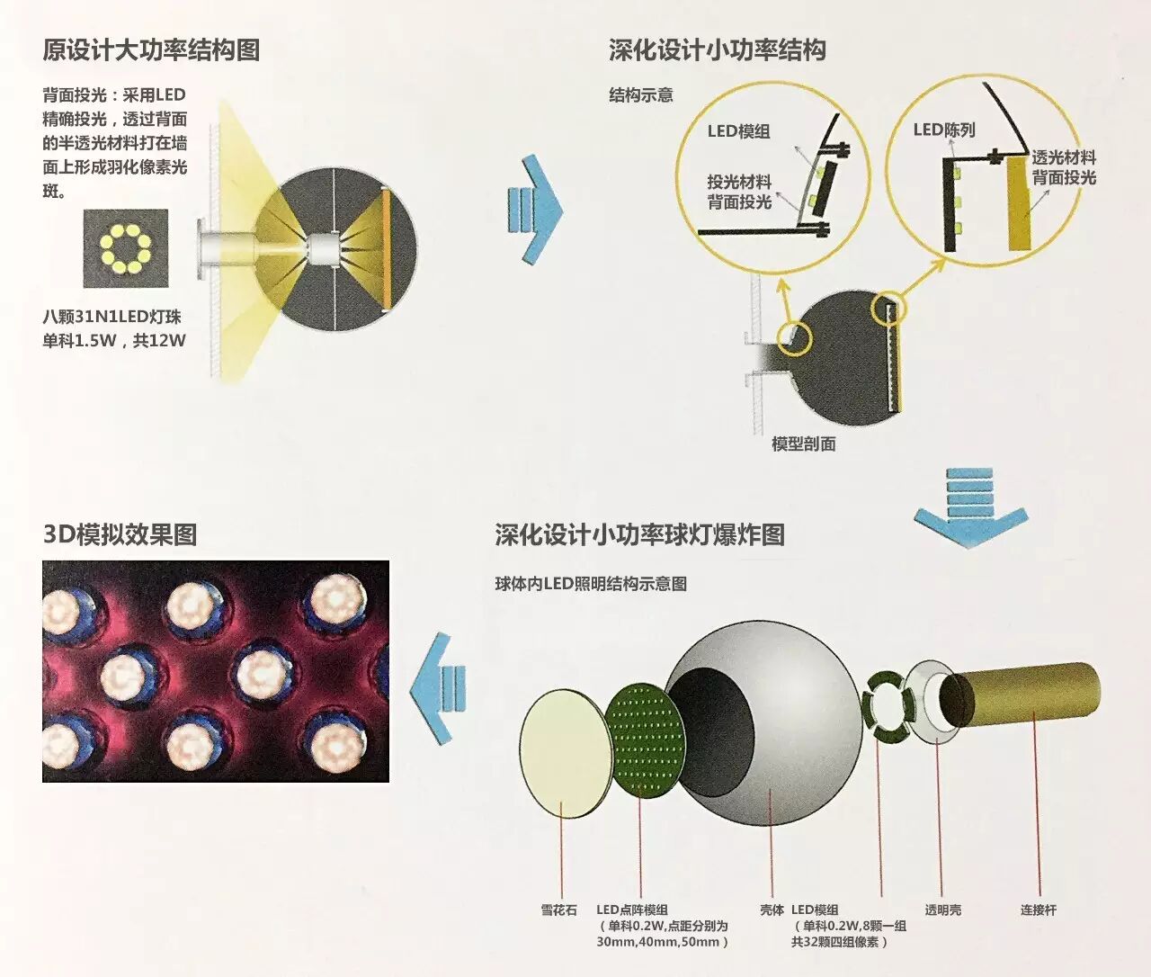 在建筑设计方案阶段,建筑师原设想用大功率LED光源系列,这不仅需要配光精准的透镜,且需要较高的散热要求。同时原设计的背光源与背板距离较大,光的利用率较低,安装维护存在诸多问题难以解决。经设计分析及专业计算,如将光源改为成本较低,散热要求较小的小功率SMD的LED,就能降低成本,而让光源位置尽量贴近球体根部,接近被照面,就可以将光源数量减少,有效降低灯具功率,并利于隐藏。