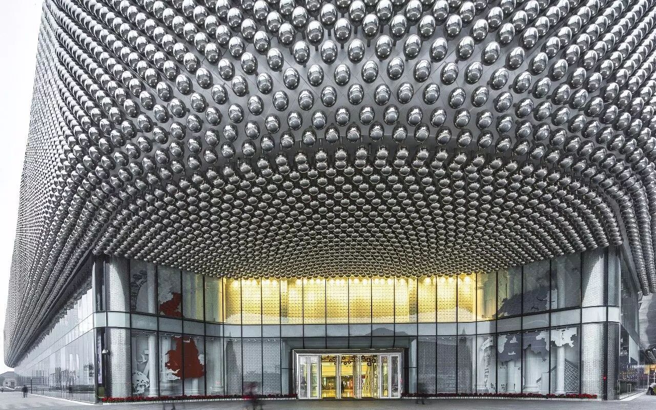 灯光与幕墙有机结合,让光成为幕墙的组合部分,通过对材料与结构的精心构思,使包裹在建筑外部的九种不同的不锈钢球仿若涟漪,又似丝缎。