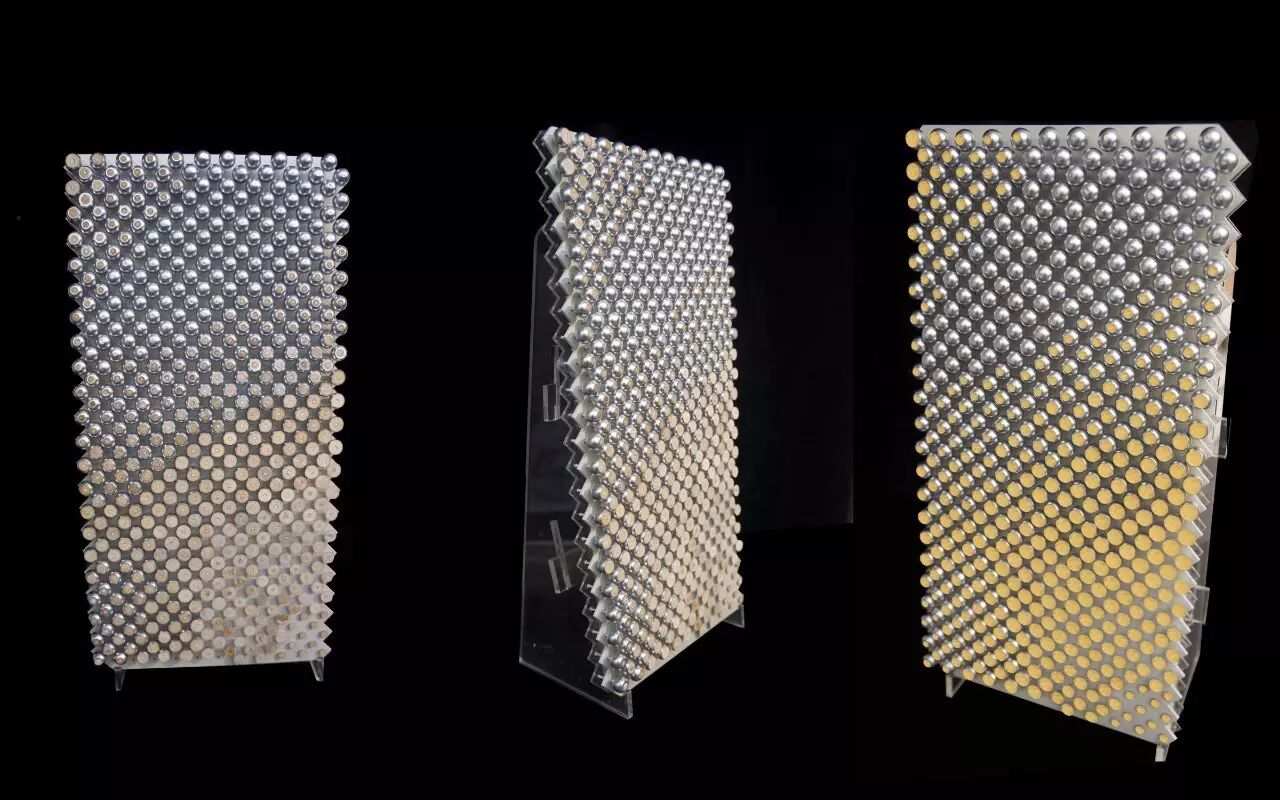 作为像素单元的不锈钢球内只有发光器件。表贴型LED灯焊接在定制铝基板上。发光角110度。投光在均光玻璃上,羽化像素光斑。每个光源模组0.3W,共使用成品SMD的LED光源模组310万粒(PCS):10号球最多,单球200PCS,60W/球:8号球最少,单球52PCS,16W/球。媒体幕墙用电峰值功率800KW/h。