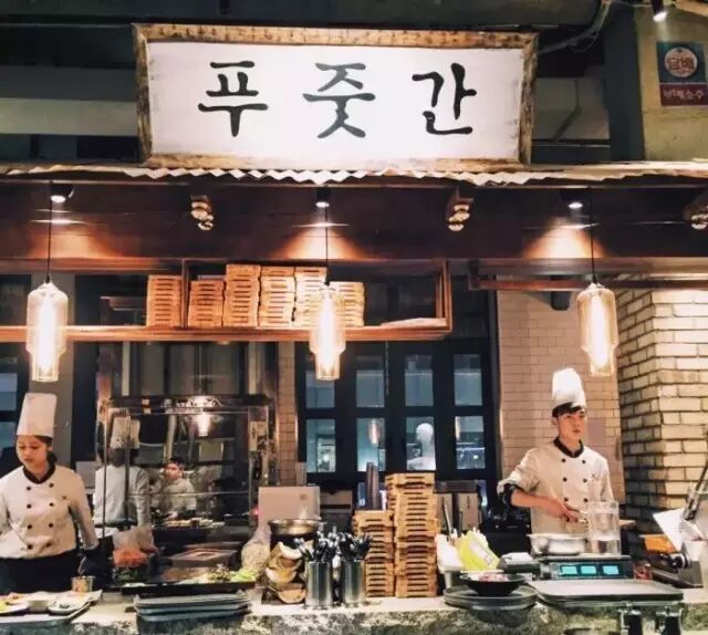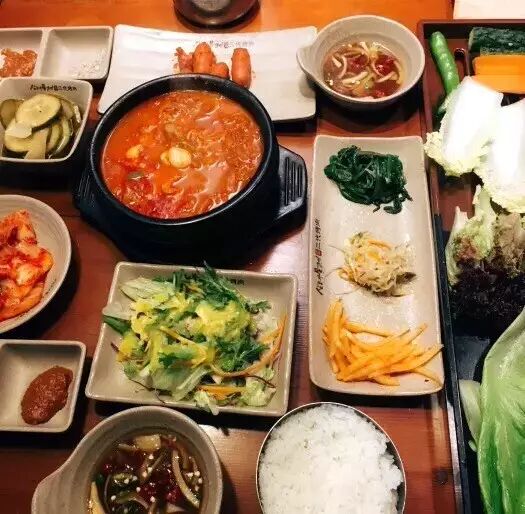 整个环境做的蛮复古的,像在韩国一家开了很久的老店。厨房是开放式的,可以看见大块的生肉猪皮啥的。有一点要说明,这家韩式料理有特别丰盛的小菜!! 超级多!!一桌子!!居然还有香肠!!调料跟别家相比也有点特别,除了传统韩式辣酱,还有一个粗盐,一碗自调的汤水酱汁,带点酸味。