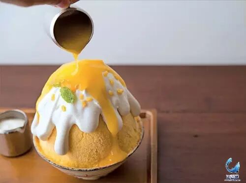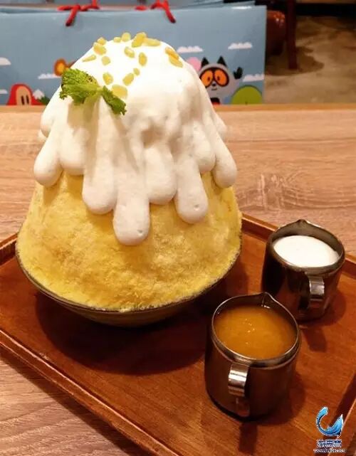 一份芒果糯米饭刨冰足足高达 13cm!顶层是以芒果和椰奶制成的芒果刨冰,入口香甜,口感绵软而细腻。但是惊喜远远不止这一点,可以任意浇淋的芒果汁和椰浆还会带给你更大的满足!甜甜的芒果汁刨冰搭配咸咸的浓稠椰浆,滋味超级特别!