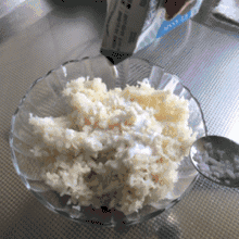 把之前固型的糯米取出放在盘里,如果不好取出就用勺子在碗内沿边划半圈,这样很好就“脱模”了,哈哈哈哈,怎么搞得好像在做蛋糕一样。