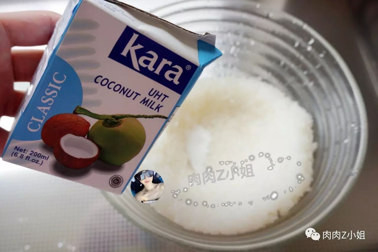 把蒸好的糯米取出放在一个大腕里,拿出准备好的椰浆适量的倒在糯米上进行搅拌。(PS:椰浆的多少根据糯米的多少衡量,少量多次按自己喜好,因为椰浆本身没有甜味,所以不用担心失手倒多了会太甜。)