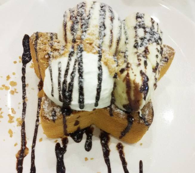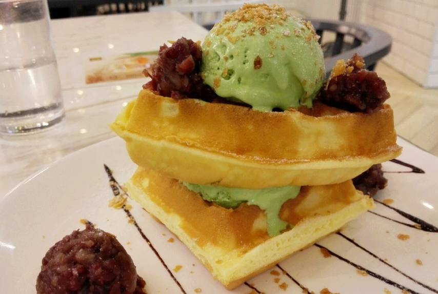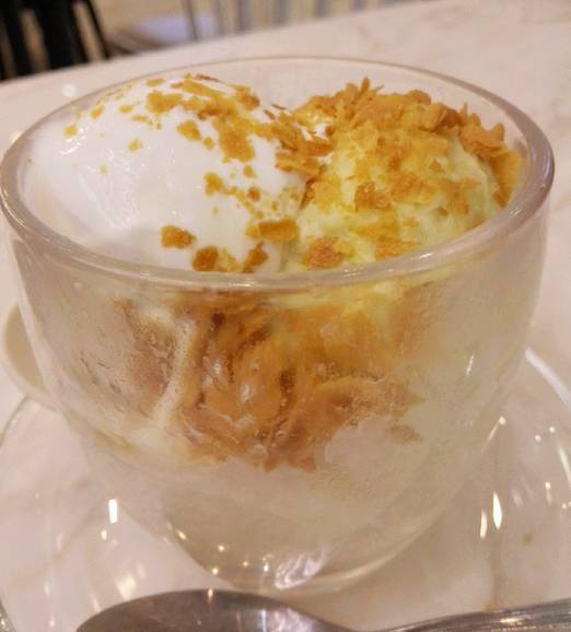 松饼刚做出来还是热的,外脆内软,配合雪糕球一冷一热,上面有芒果及草莓粒,增添了口感,绿茶雪糕一般,不爱这个红豆,太甜。