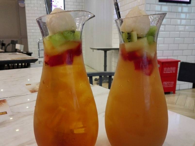 鲜果茶真的有很多果肉,草莓、菠萝、奇异果及荔枝等。茶味很浓,应该是红茶。