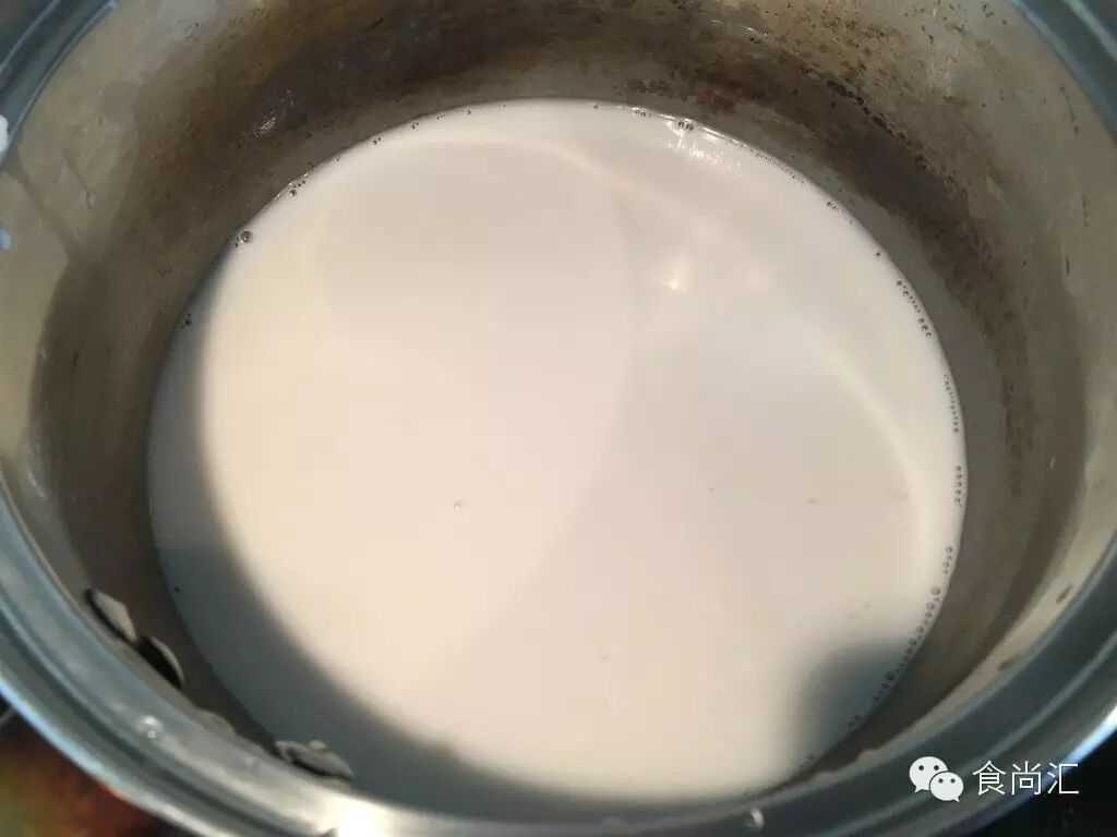4. 将椰浆倒入小奶锅,小火加热,放入糖和盐,也可以根据个人口味(不太喜欢甜的,可以少放糖),记得不断搅拌,待椰浆浓稠了就可以关火了❀▽❀