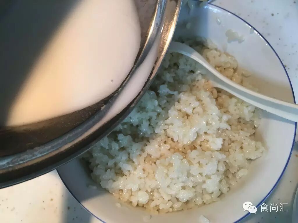 5. 煮好的椰浆(一大半左右)倒入蒸好的糯米饭中,放置5-7分钟,让糯米充分吸收椰浆。(这步千万不可省哦!~静置过的糯米会变得更加软润和Q弹)❀▽❀