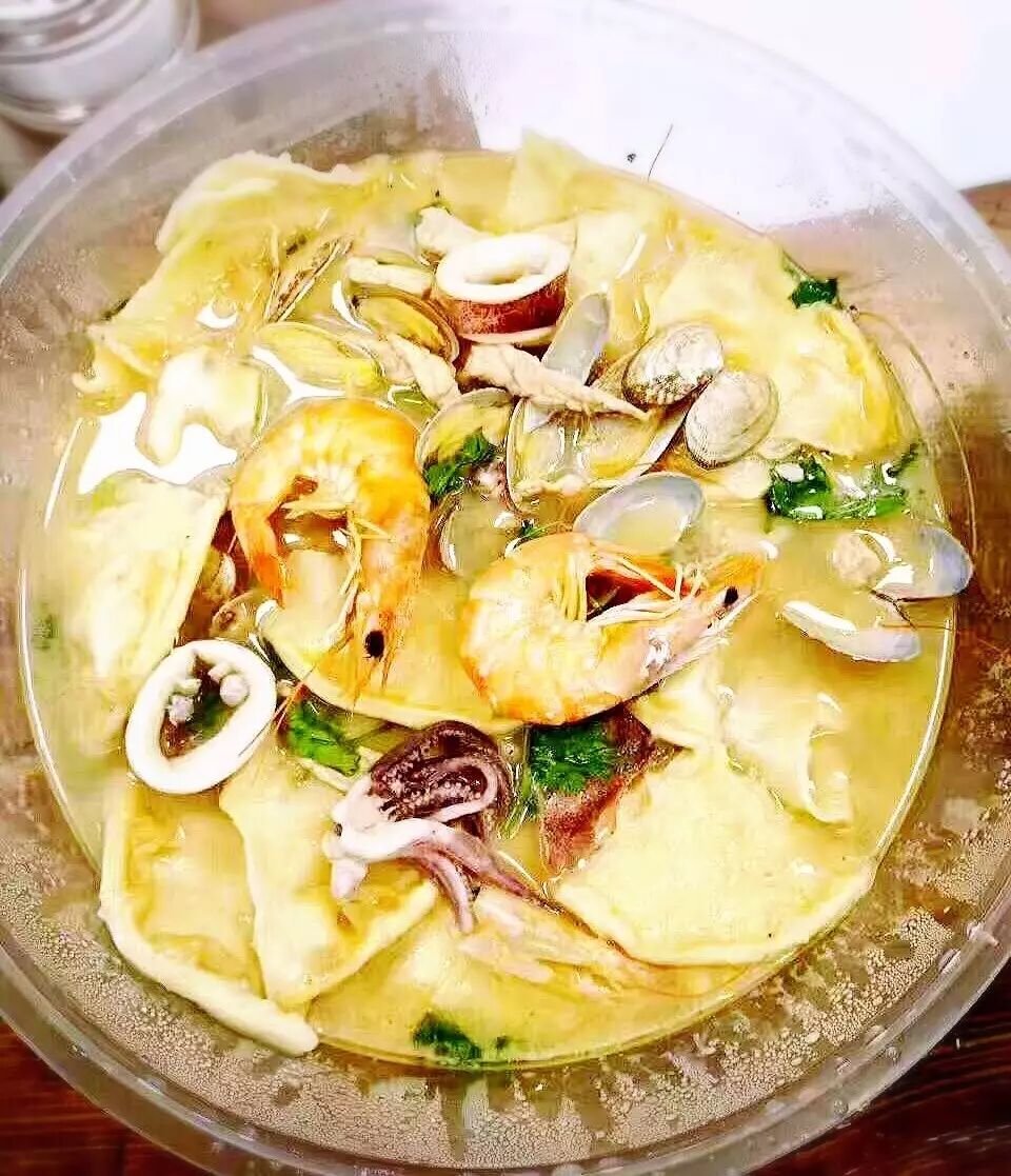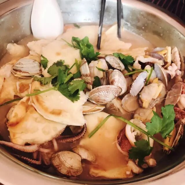 海鲜烩饼实惠量大,一盆热乎乎的烩饼端上来,五花肉、大虾、蛤蜊、笔管鱼和饼和谐的泡在汤里,静待你把他们干掉。喝一口汤,你以为这根本不是外来菜,而是亲戚的私房菜,总之,这味道,像极了我们日照的乌子煨肉,谁让乌子的鲜味,不管到哪儿都是主角呢?!