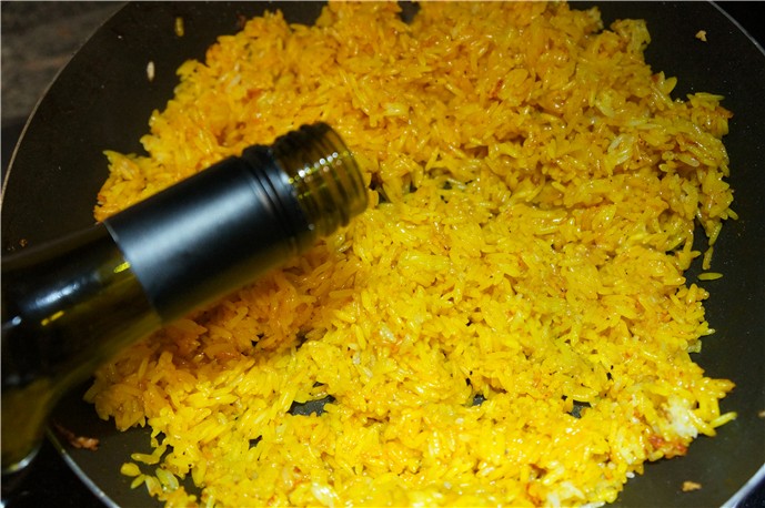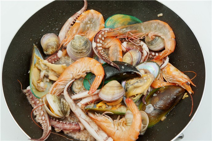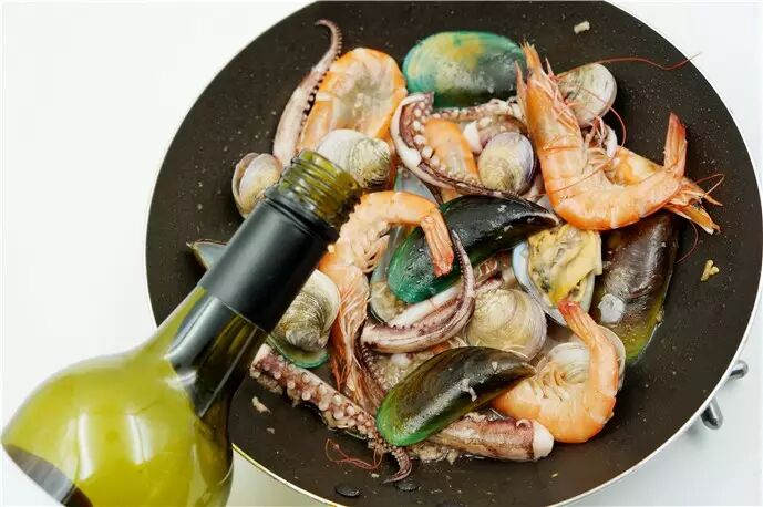 4 海鲜炒香后加入20ml白葡萄酒、少许海鲜翻炒