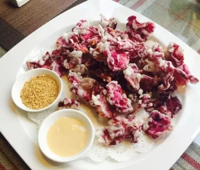 这道菜是季节性的,如果没有上好的玫瑰材料是不会出菜的,老板搭配有两种蘸酱,小清新般玫瑰花瓣配上自己喜欢的蘸酱,给你不一般的口感体验。