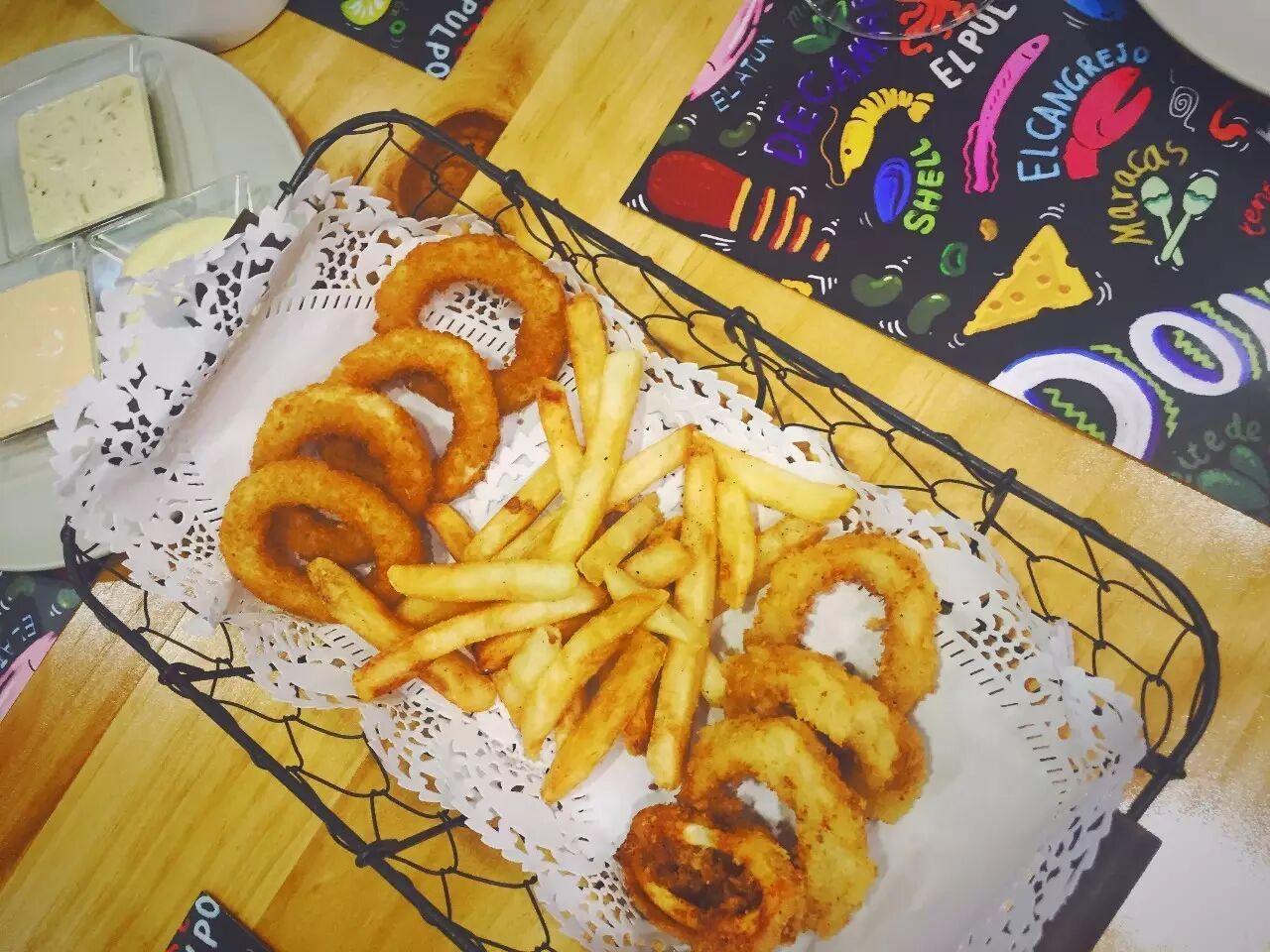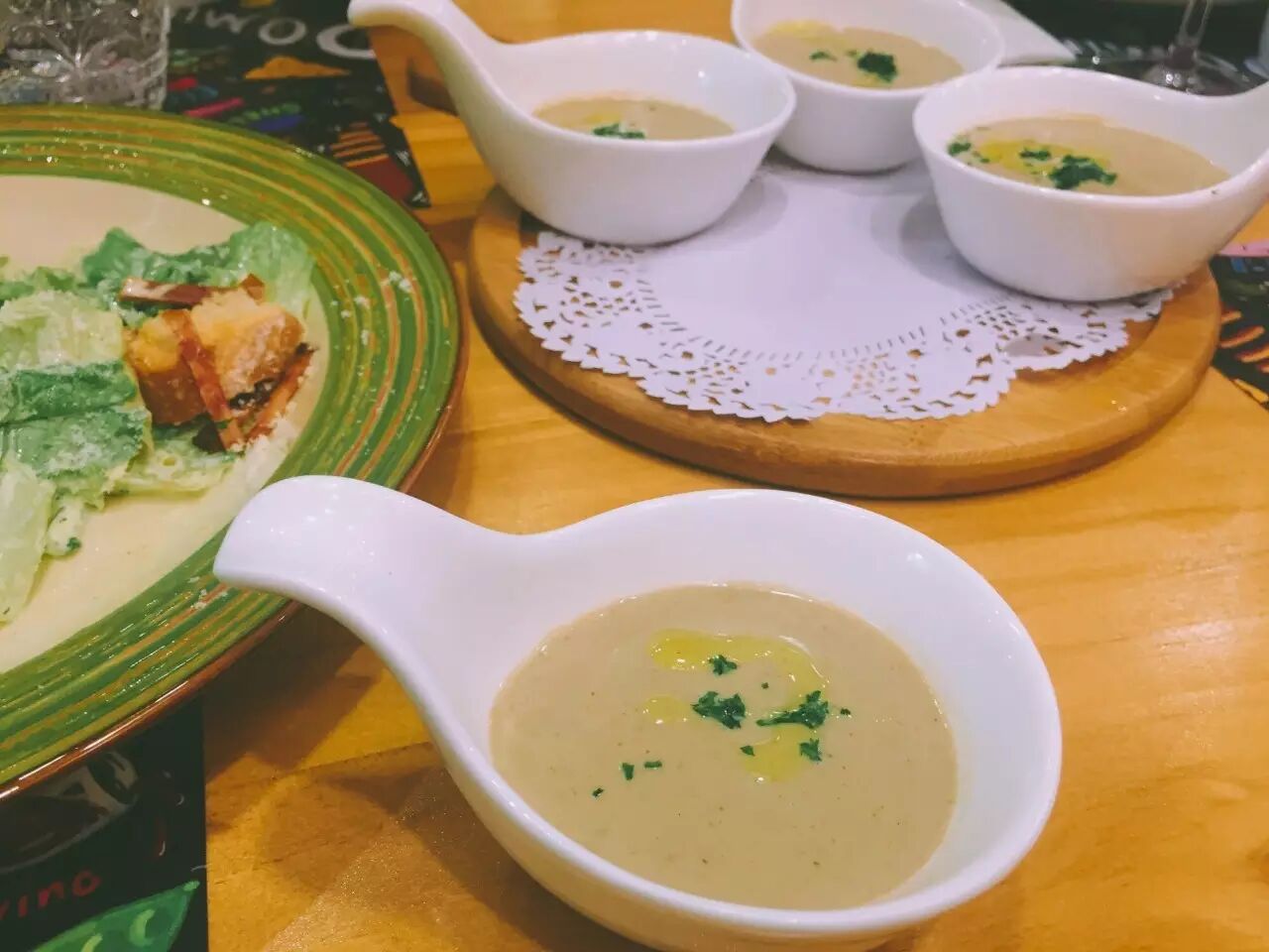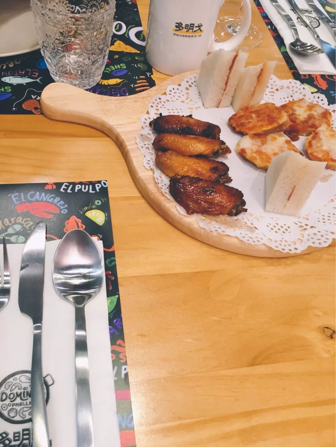小食在摩肩接踵的推杯换盏下陆续上来。150-249间的价格包含了零食、前菜、例汤还有等待见证的西班牙海鲜烩饭。