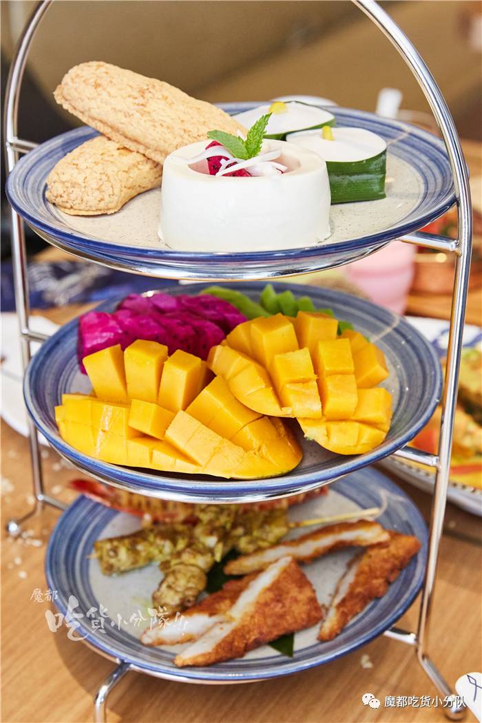 一顿普吉岛风情的下午茶套餐,有沙嗲烤串和虾,新鲜的芒果和时令水果,还有椰奶冻和榴莲泡芙,三层下午茶装置适合两个人来小憩。一斤以上的印度尼西亚咖喱肉蟹和牛上脑生菜包也可以尝的到!