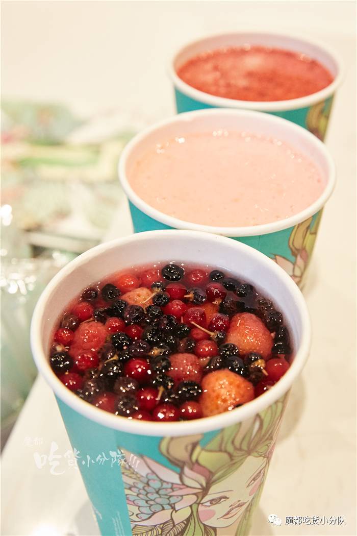 一家果汁奶昔果茶集合店,有个堪比魔幻小说的背景故事,所有饮料名字都很玄幻:精灵女王,北境之夜,天空之蓝等等。原料都是速冻的莓子,树莓蓝莓草莓黑加仑,个人推荐果茶,清甜不腻,颜色也很好看。