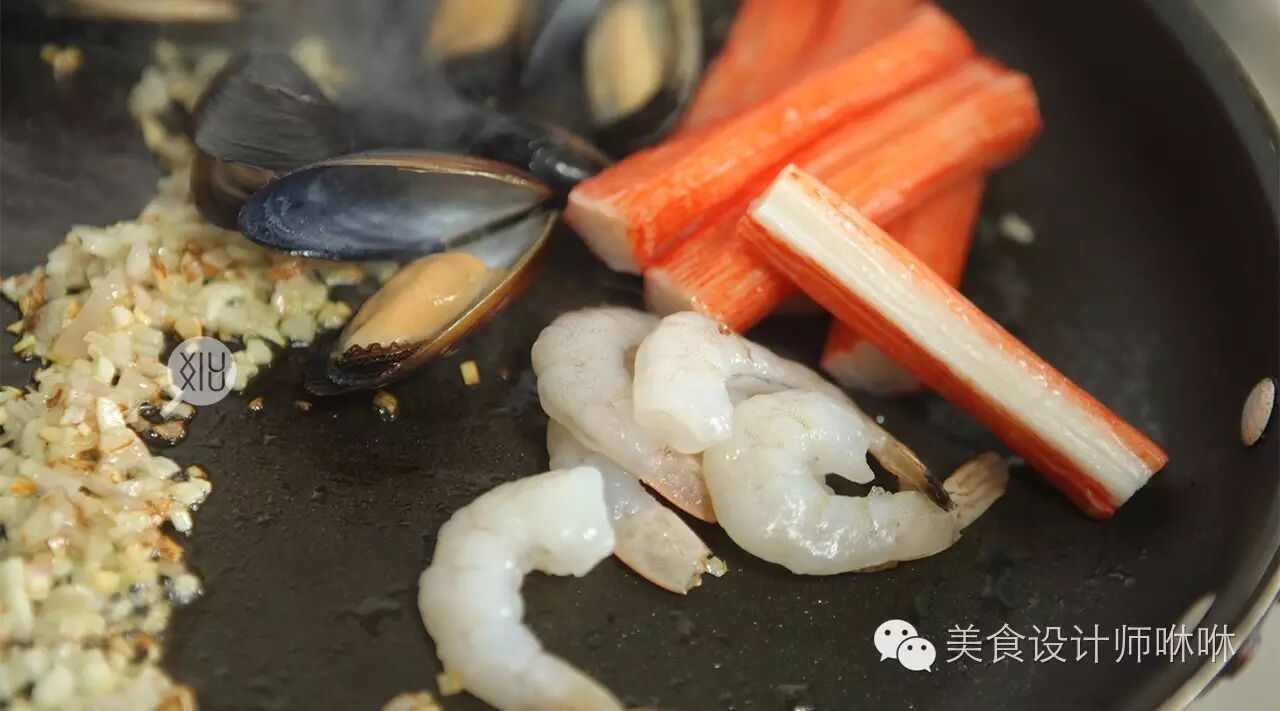 等高汤基本被米吸收后,开盖,放入之前炒制的海鲜,轻轻按到米饭中,加入切碎的欧芹和藏红花水,盖上盖小火焖3min,然后开盖大火收汁。
