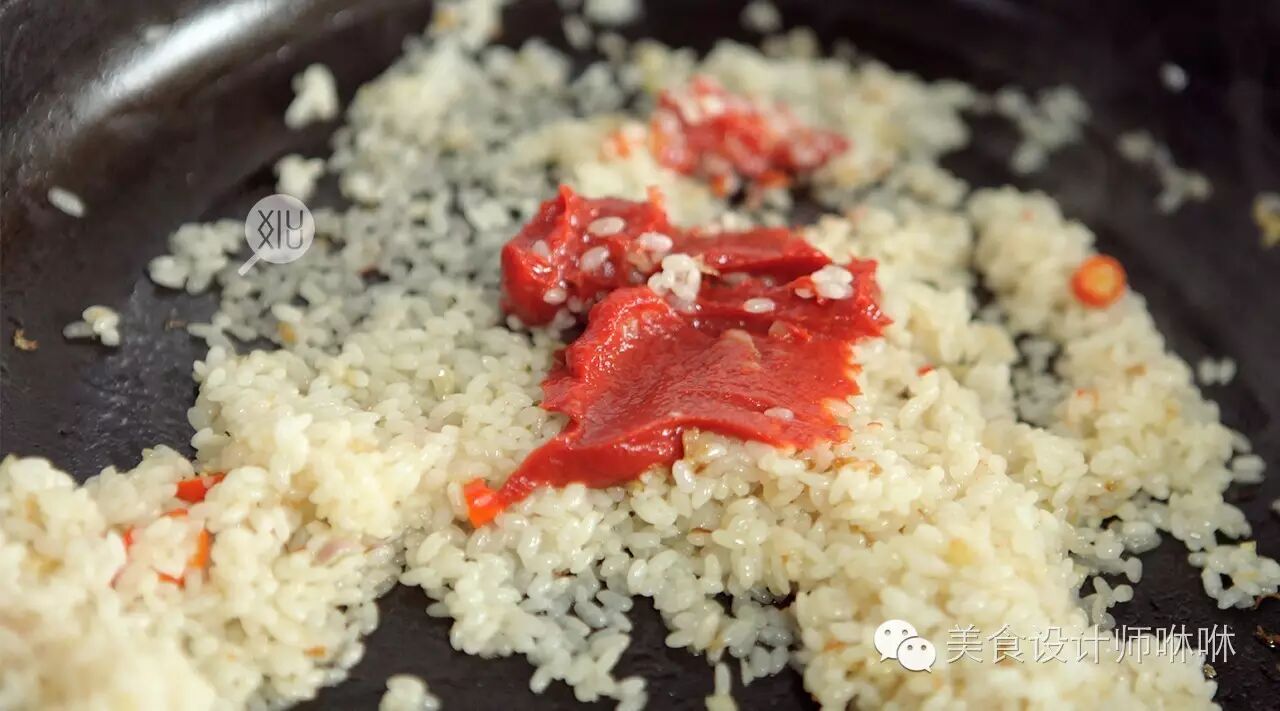 不需要洗锅,也不需要把锅中的洋葱、大蒜末倒掉,直接加10ml橄榄油,放入150g大米,大火炒20s后放入小米椒碎和番茄膏。
