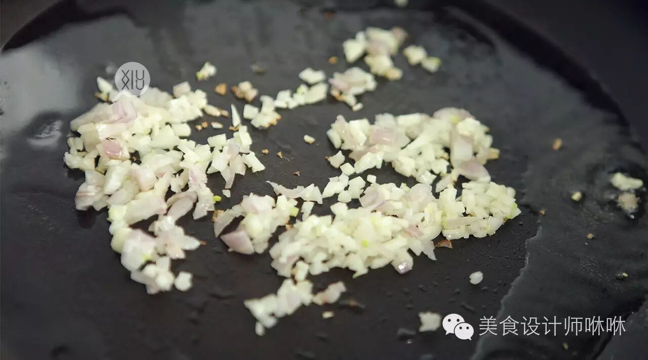 热锅,倒入5ml的橄榄油,加入洋葱末和大蒜末爆炒30s至香气四溢。