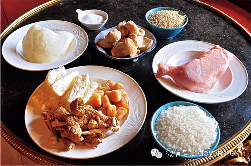 糙米150克、白米150克、鸡肉800克、巴西菇80克、竹笙80克、海螺50克、鱼肚30克、干贝30克