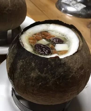 产自海南的椰子,椰肉色白如玉,芳香滑脆,椰汁清凉甘甜。以原盅炖原汁,汤清味甜,汤水中仍保有独特椰香。