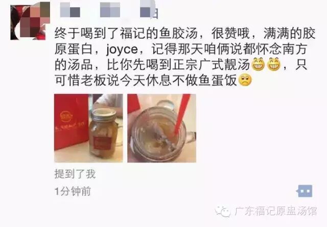 店里的主打是鱼胶类的汤品,咱家老板娘在孕期备孕期一直都在喝鱼胶汤,皮肤上从未出现任何斑纹,也从不曾感冒,最重要的是长胎不长肉,受到广大女性朋友的热爱及欢迎!而鱼胶炖鸡则以福记大厨广东酒店直邮来的走地鸡为主料加以炖制,独家配方,味道极其鲜美!