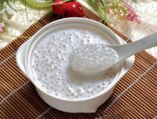 3.煮椰汁:把椰汁倒到锅里,加入适量的清水加以稀释,再加入适量的白糖,煮开,倒入香芋和西米搅拌均匀即可。