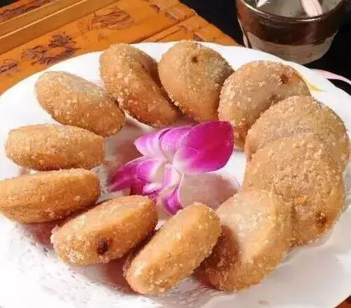 4、将炸锅温度控制在210℃(八成热),香芋饼一个个下锅,并不断翻面,当呈金黄色时捞出沥干油分,即可装盘。