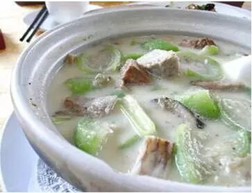 3、投入水瓜、蚬肉,与香芋一起煮,调入盐、鲜奶,至水瓜熟即可。