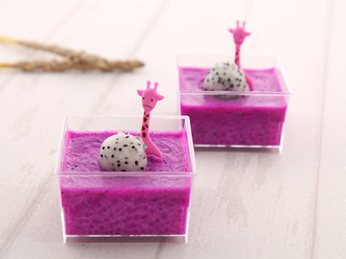 西米40克、红心火龙果果肉250克、椰奶60克、吉利丁片5克