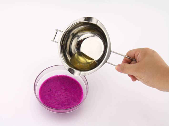 5、将搅拌好的火龙果汁倒入碗中,再加入加热融化了的吉利丁。
