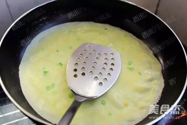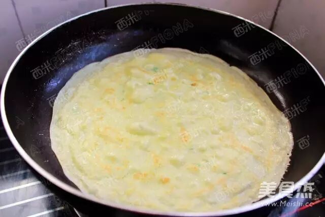 4.平底锅加热,倒入适量油,转动锅子,使油分布整个锅面。小火,舀一勺面糊在锅子中间,转动锅子,让面糊平摊锅面。记得要小火,火大了的话,外面焦了,里面没熟。如果觉得面糊厚了,待表面凝固,用铲子轻压面饼,哪边厚,就压哪边。