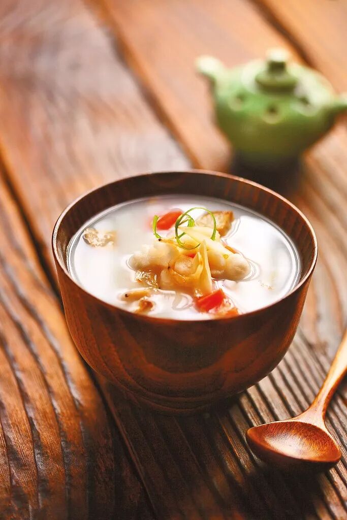 3、投入水瓜、蚬肉,与香芋一起煮,调入盐、鲜奶,至水瓜熟即可。