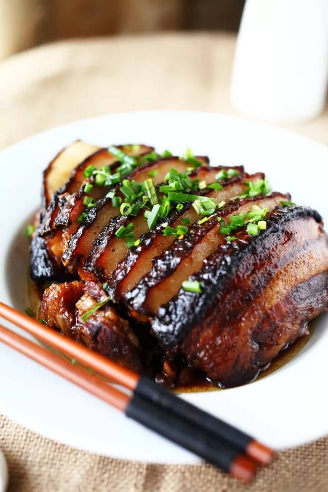 2、用牙签在煮好的肉上扎一些小孔,用5ml左右老抽均匀地涂抹五花肉表面;