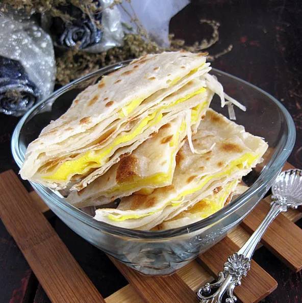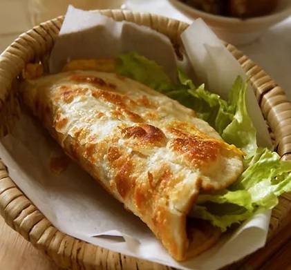 15 | 电饼铛或平底锅放少量花生油,五成热时放入饼,煎五六秒,翻面煎另一面。注意观察,饼中间慢慢鼓起一个泡。