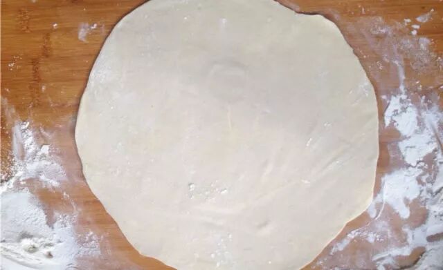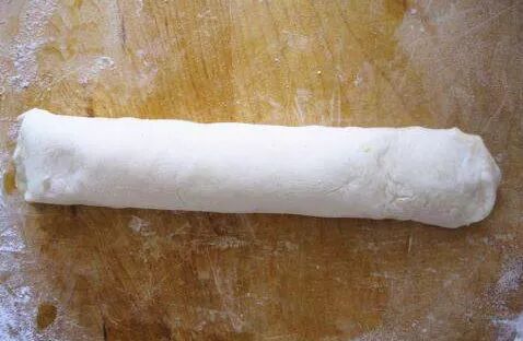 7、然后将铺满馅的饼卷起来,两边封口捏紧。轻轻压成饼状。