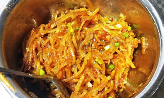 4、腌制过的萝卜丝挤干水分,加入适量盐、白糖、胡椒粉、姜粉、鸡精、蚝油、酱油、葱花,再加入香油拌均匀。
