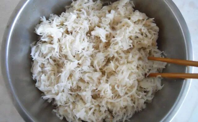 3、萝卜洗净去皮,擦成丝加少许盐腌制15分钟。