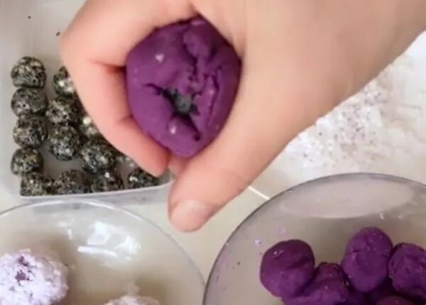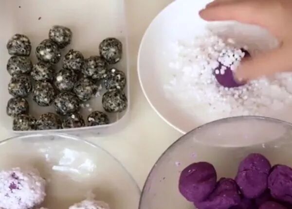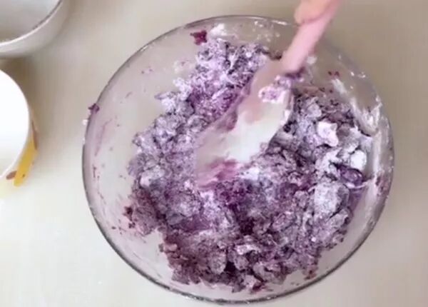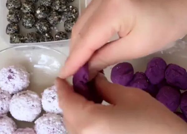 3. 紫薯泥加入糯米和牛奶,混合揉成团