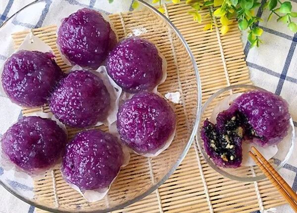 食材:西米200克、紫薯泥500克、糯米粉100克、糖50克、牛奶100克、黑芝麻花生馅