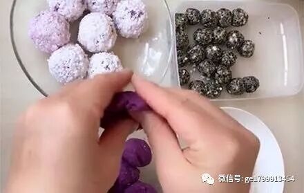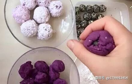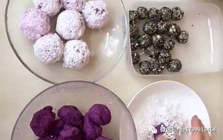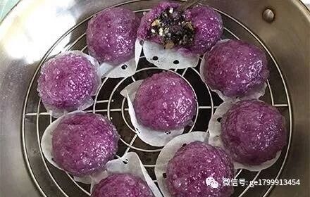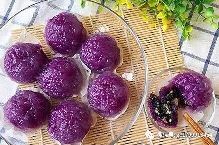西米紫薯球 2023-04-19 23:50:29 准备材料:西米、紫薯泥、糯米粉、糖、牛奶、黑芝麻花生馅做法:1、紫薯上锅蒸熟去皮,取500g加糖压成泥;2、包馅之前提把西米浸泡10分钟,捞出备用;3、紫薯泥加入糯米和牛奶,混合揉成团;4、取30g一个剂子,捏成小饼;5、包成馅料滚圆;6、黏上西米,用手粘实;7、蒸屉上垫油纸,开水上锅蒸15分钟左右,成透明状即可;8、蒸熟的西米紫薯球非常漂亮和好吃哦!