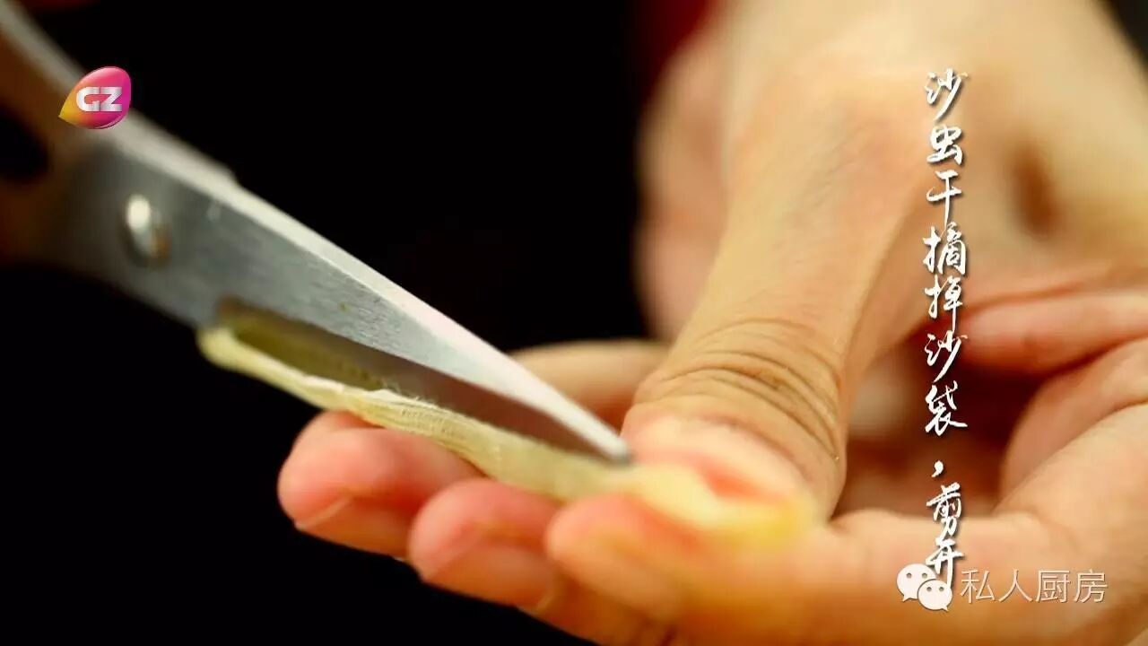 沙虫干去沙:沙虫干摘掉沙袋,剪开沙虫