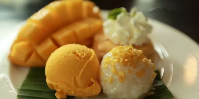 这道在泰国本土被当做主食的一道甜点,其所用椰浆糯米的喷香软烂,搭配着奇香特甜芒果切片,形成一种微妙的平衡。