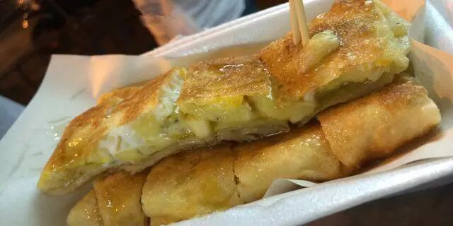这里的煎饼用的是玉米和小米混合面,摊制后外层特别酥脆,包裹着香蕉的香脆煎饼,淋上一层巧克力酱提升口感,真的是吃在嘴里,甜在心里。