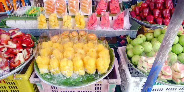 这里也有一种神奇的饮食,叫做“辣椒盐配热带水果”。店家贴心的把水果切成一块一块,放在袋子里,并且每袋都附赠一小包辣椒盐,用于搭配着吃。